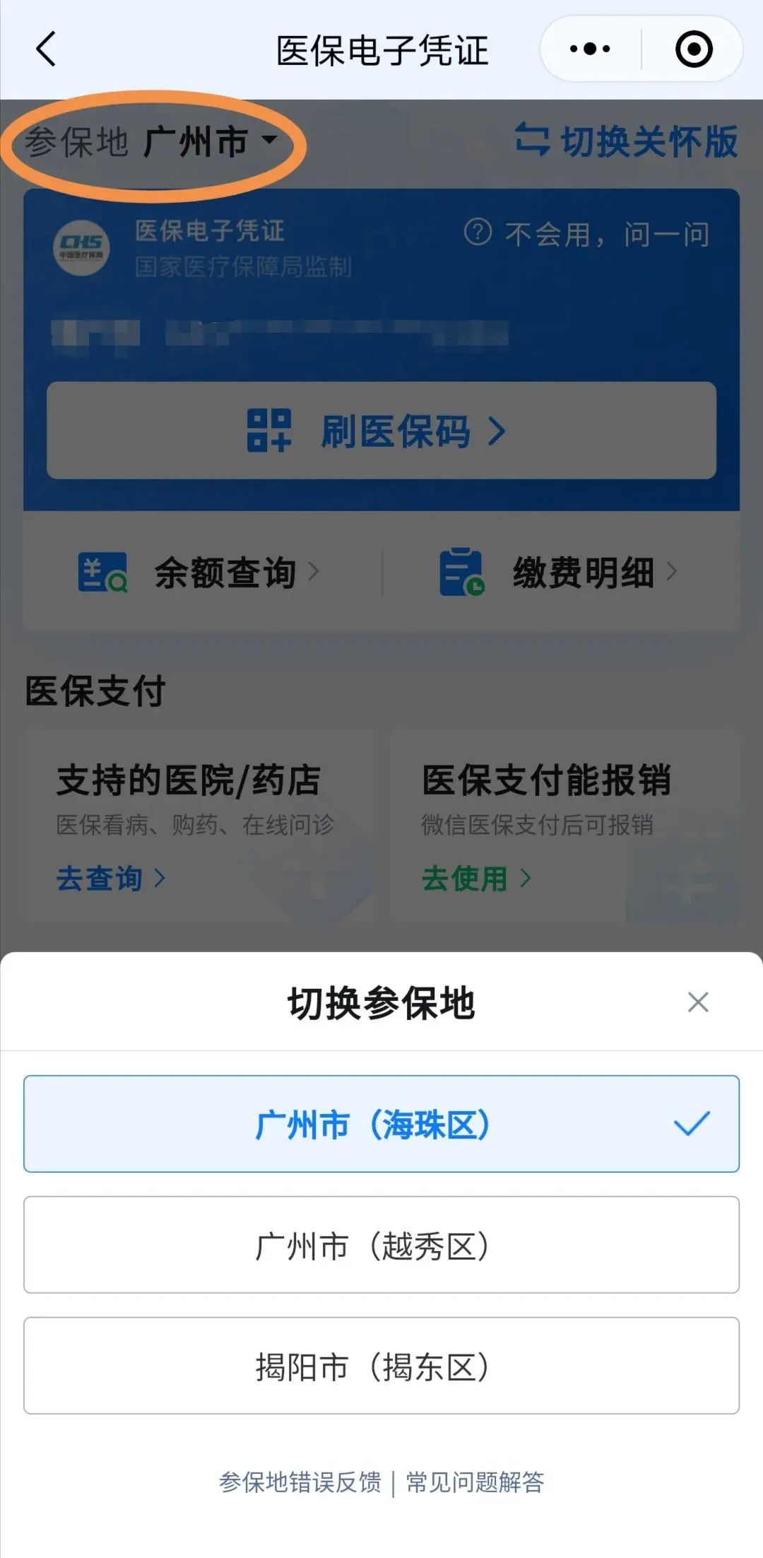 ②如果仍未显示,可以联系参保所在医保经办机构,进行参保信息补报。参保信息补报完成后,重新打开国家医保app、“粤医保”微信小程序、微信、支付宝等任一渠道的医保码(医保电子凭证)页面,点击参保地切换选择城市就可正常使用。