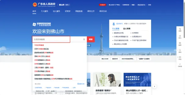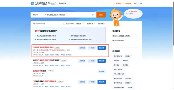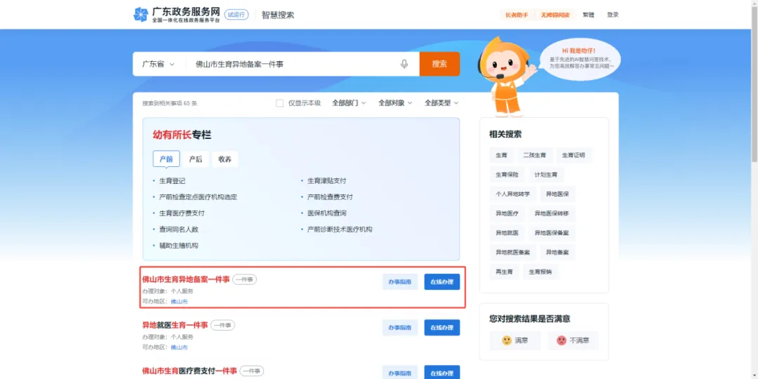 以佛山为例,根据申请事项名称搜索“生育异地备案”“产前检查定点医疗机构选定”,选择“在线办理”-“可办地区(根据参保所属区选择相应的医保经办机构)”即可申请办理相应的事项。